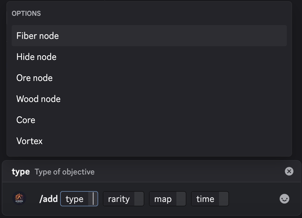 typechoiceRequiredThe objective type (node, core, or vortex)raritychoiceRequiredTier for nodes or color for cores/vortexesmapstringRequiredBlack Zone map nametimestringRequiredTime remaining until spawn (HH:MM format)Syntax