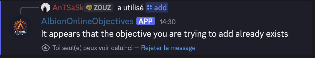 If an objective with the same type, rarity, and map already exists within an 8-minute window (±4 minutes of the reported time), the bot rejects the new report and notifies you. This prevents accidental duplicates when multiple guild members spot the same objective.