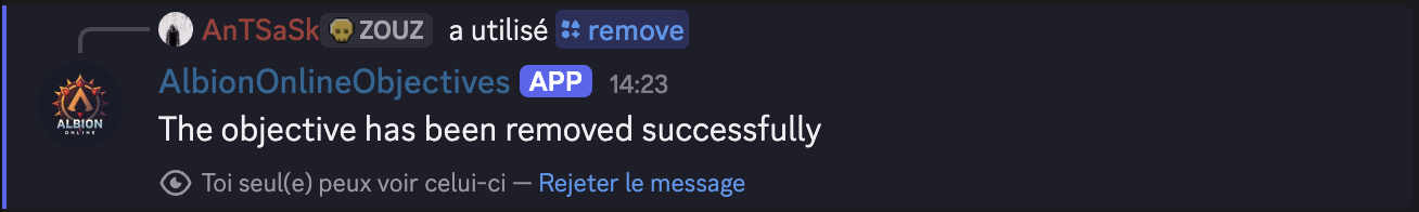 After a successful removal, the bot automatically refreshes the objective list message to reflect the change. Index numbers are recalculated.